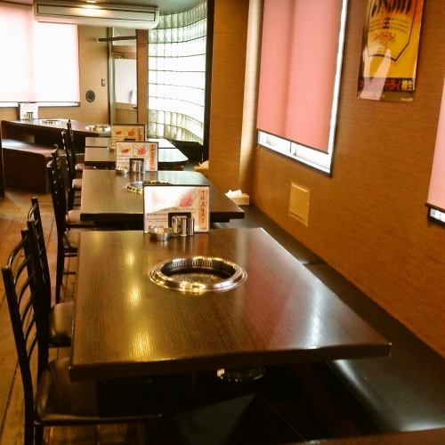 【テーブル席】 ウッド調で統一されたフロアは、木のぬくもりが感じられる落ち着いた雰囲気。テーブルも木目調で、アットホームな空気を醸しだしています。